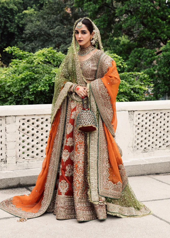 This ensemble includes two exquisite dupattas for a versatile and grand bridal look. The first is a rust-colored organza dupatta, featuring heavily embellished borders on all sides, enhancing the couture feel of the outfit. The second is a contrasting green net dupatta, adorned with detailed finishing, embroidery, and subtle embellishments, adding vibrance and elegance to the ensemble.