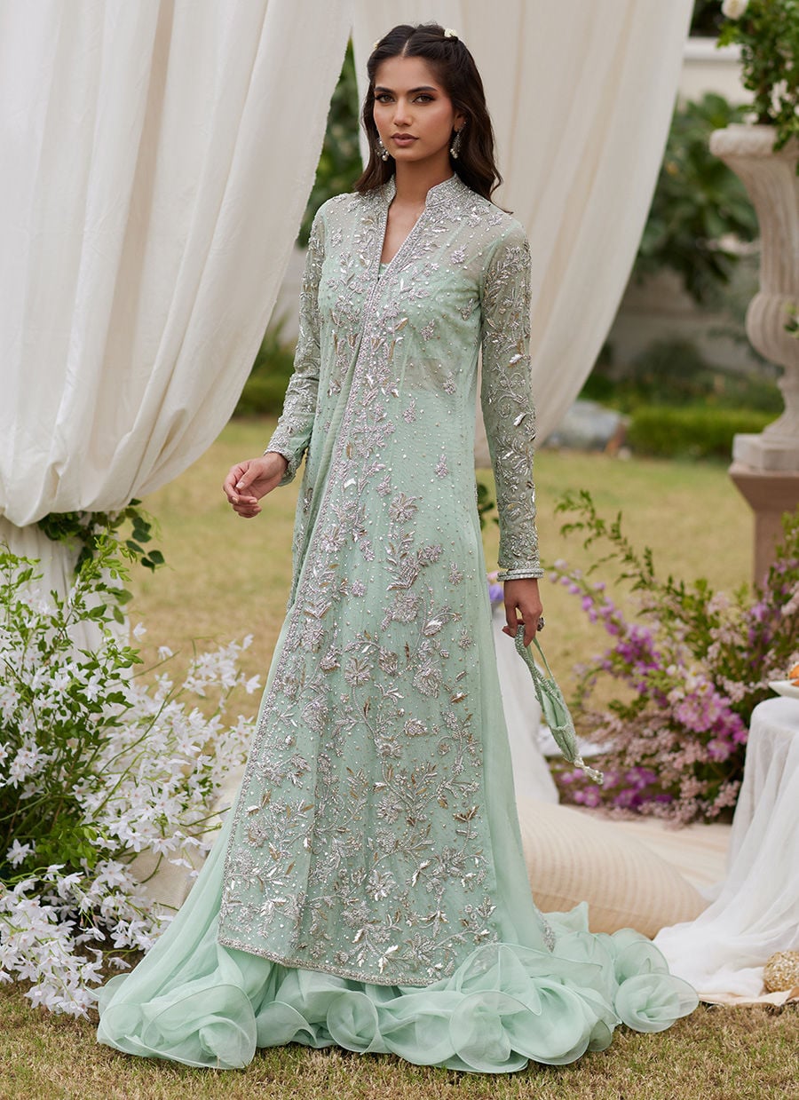A pale turquoise ensemble featuring a shimmering net jacket, intricately detailed bustier, and a flowing chiffon lehnga that creates an airy yet majestic bridal silhouette.