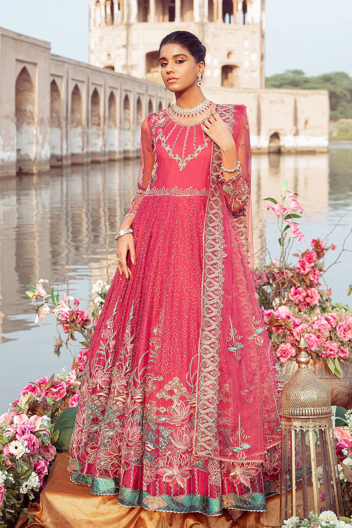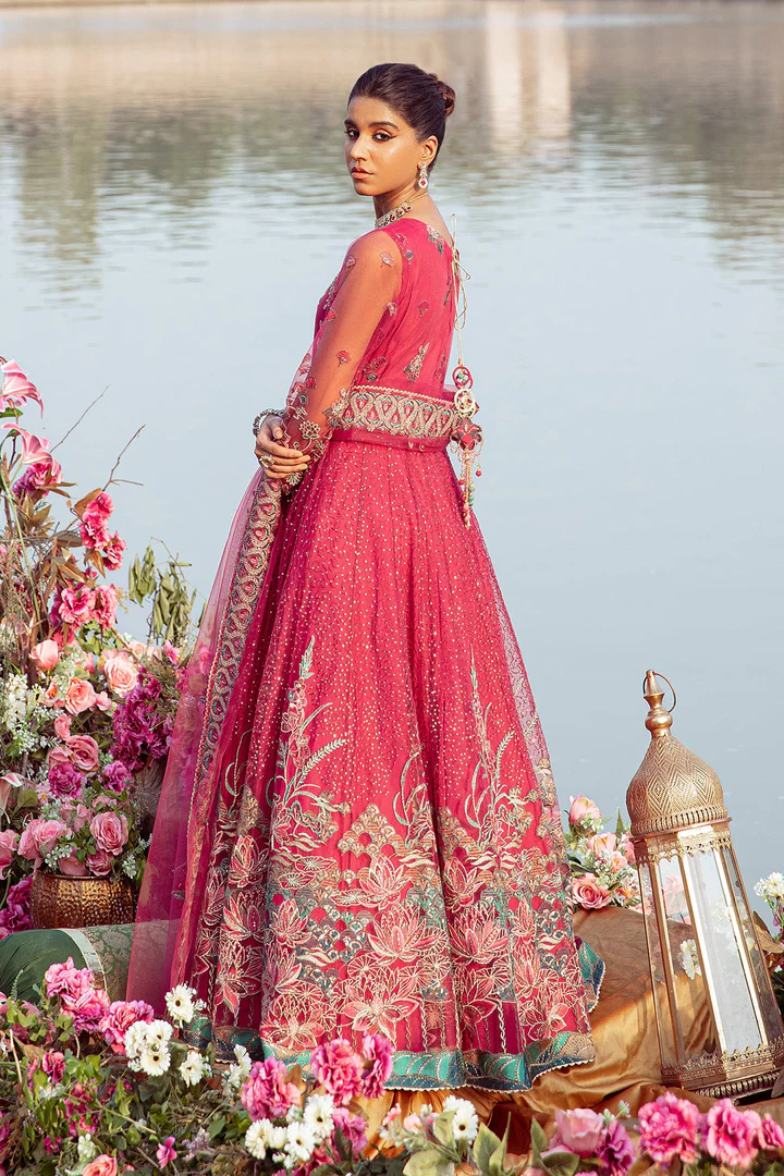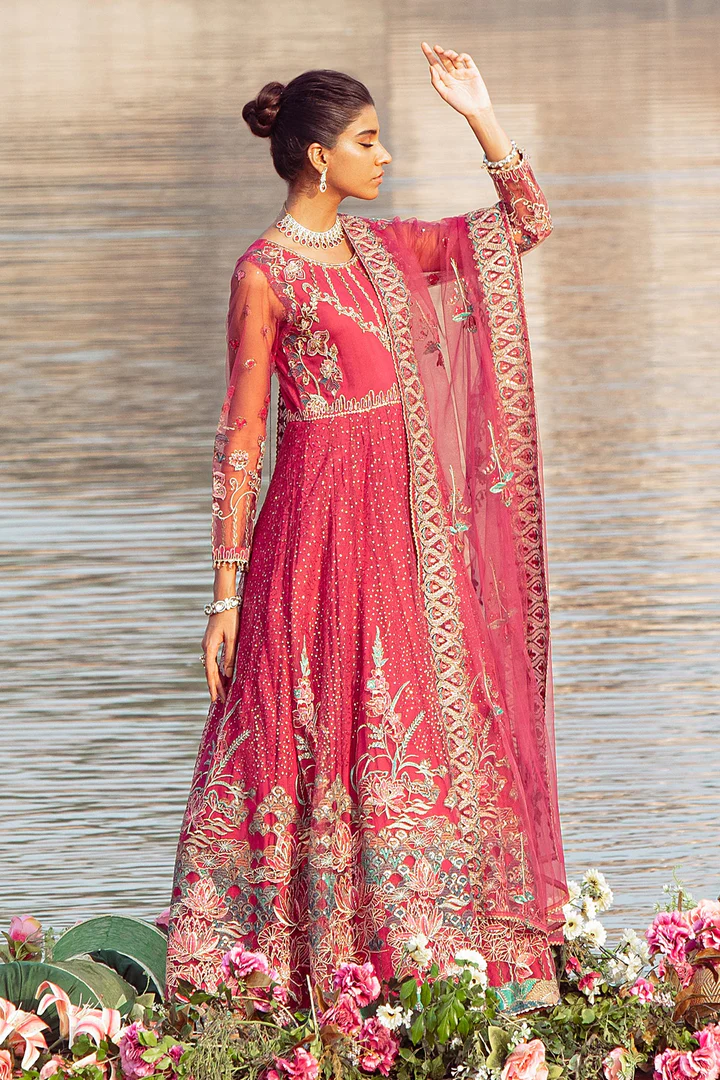 The ensemble is completed with a delicate net dupatta that elevates the elegance of the pishwas frock. Designed with scalloped borders, detailed embroidery, pearls, and silver ornaments, the dupatta adds soft shimmer and refinement. Its lightweight net texture allows for a fluid drape, perfectly complementing the embellished frock and creating a ravishing Pakistani wedding look.