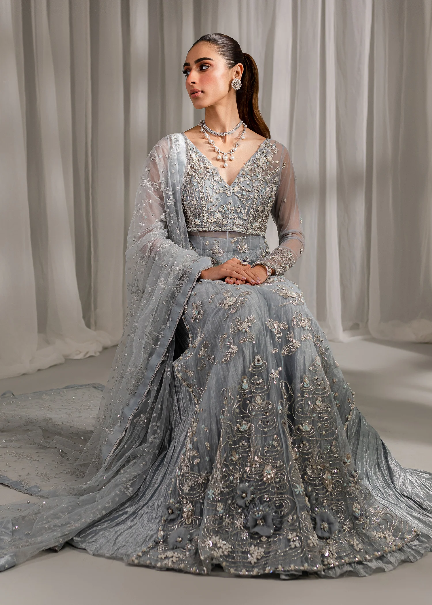 This floor-length ice blue net shirt is beautifully decorated with delicate hand embellishments that shimmer softly with movement. The front, sleeves, and hem are worked with care, giving the outfit a graceful and refined look. A smooth lining inside keeps it comfortable, and all edges are neatly finished for a clean and elegant appearance.