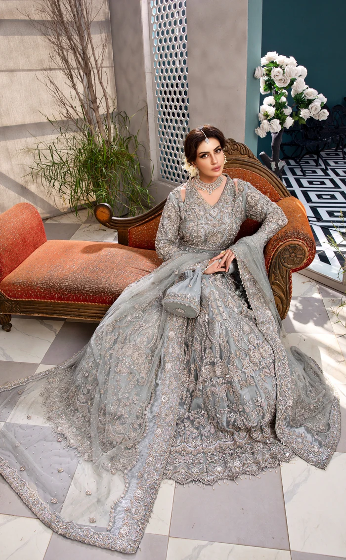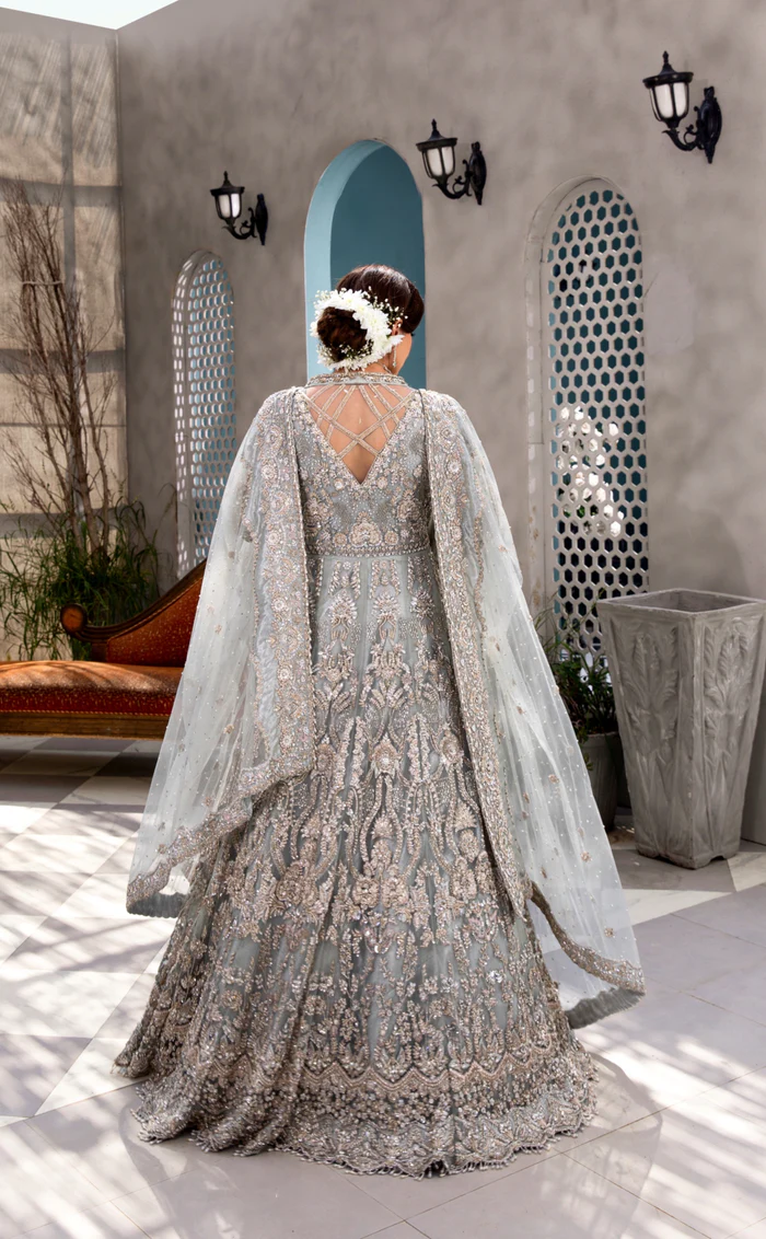 Soft, dreamy blue enhanced with contrasting pink embroidery and golden-silver zardozi detailing.