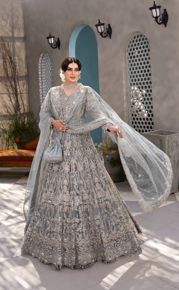 An ethereal soft blue satin bridal gown adorned with intricate pink threadwork, golden and silver zardozi, cora, dabka, pearls, sequins, and stones, paired with a delicately hand-embroidered net dupatta for a regal wedding look.