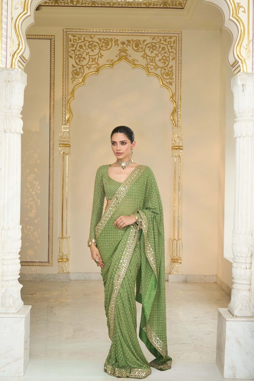 The sari is crafted in a warm olive base with beige gold accents, made from premium fabric that drapes gracefully. Intricate hand-embroidered mirrors and cutdana motifs create a dazzling star-like effect across the fabric, adding depth and refined charm to the ensemble.