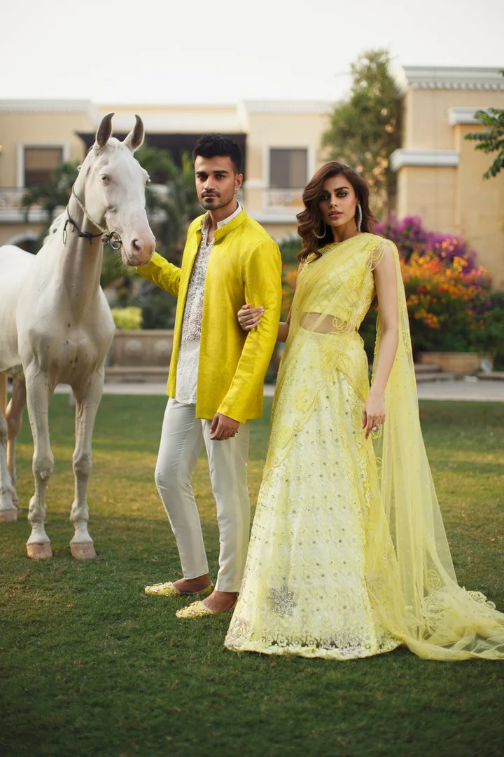 A vibrant yellow shade enriched with silver and crystal embellishments, ideal for Mehndi celebrations.