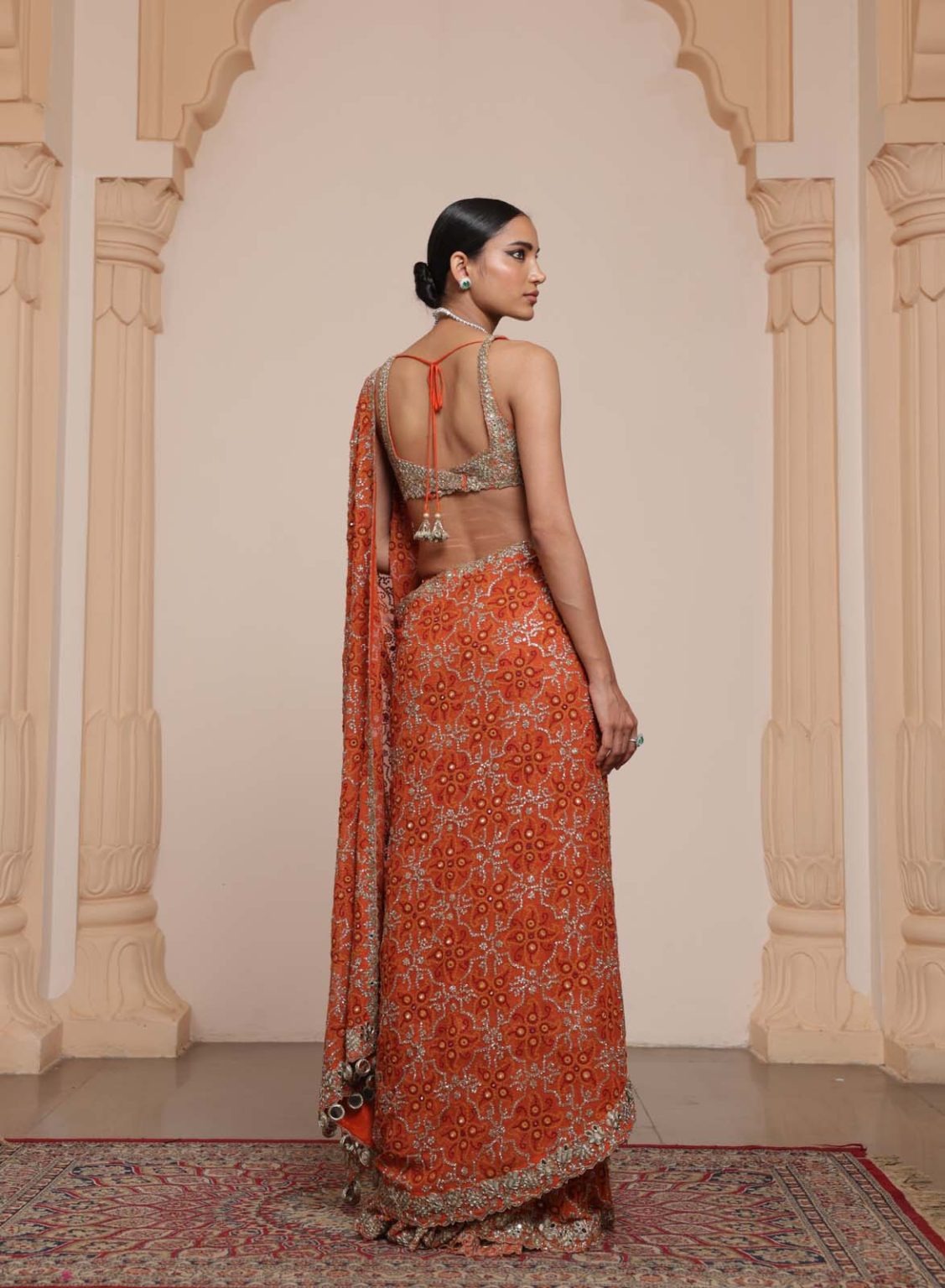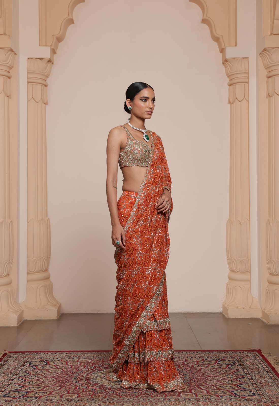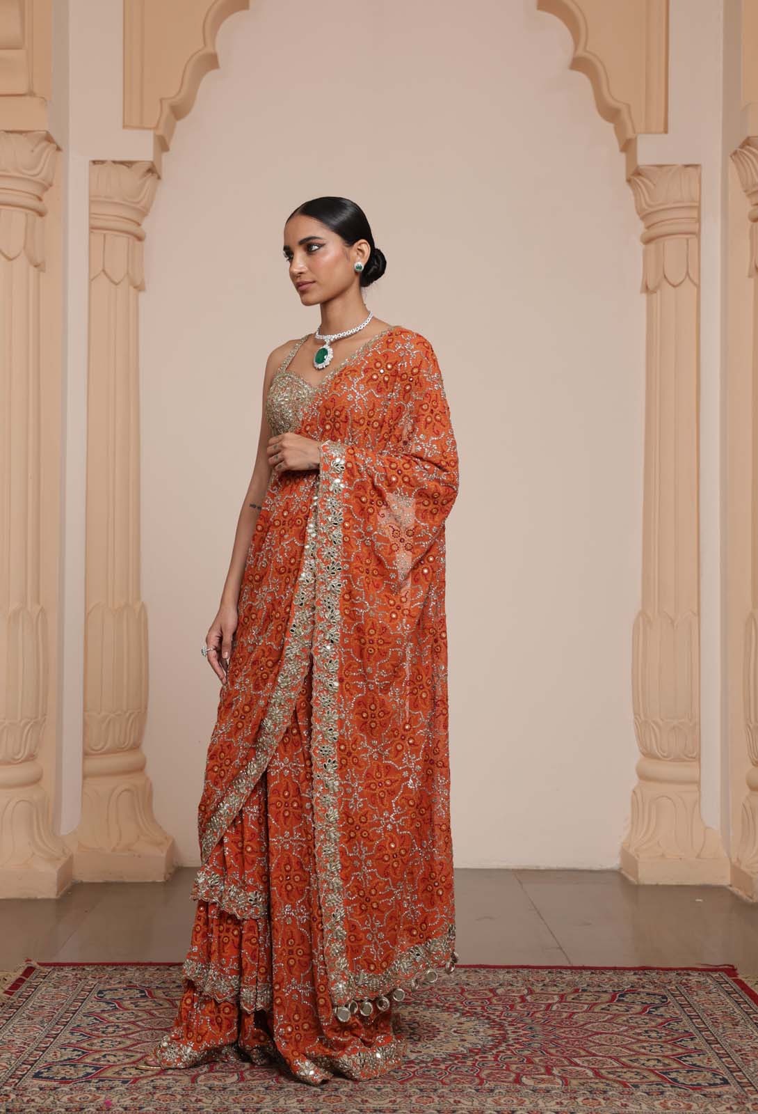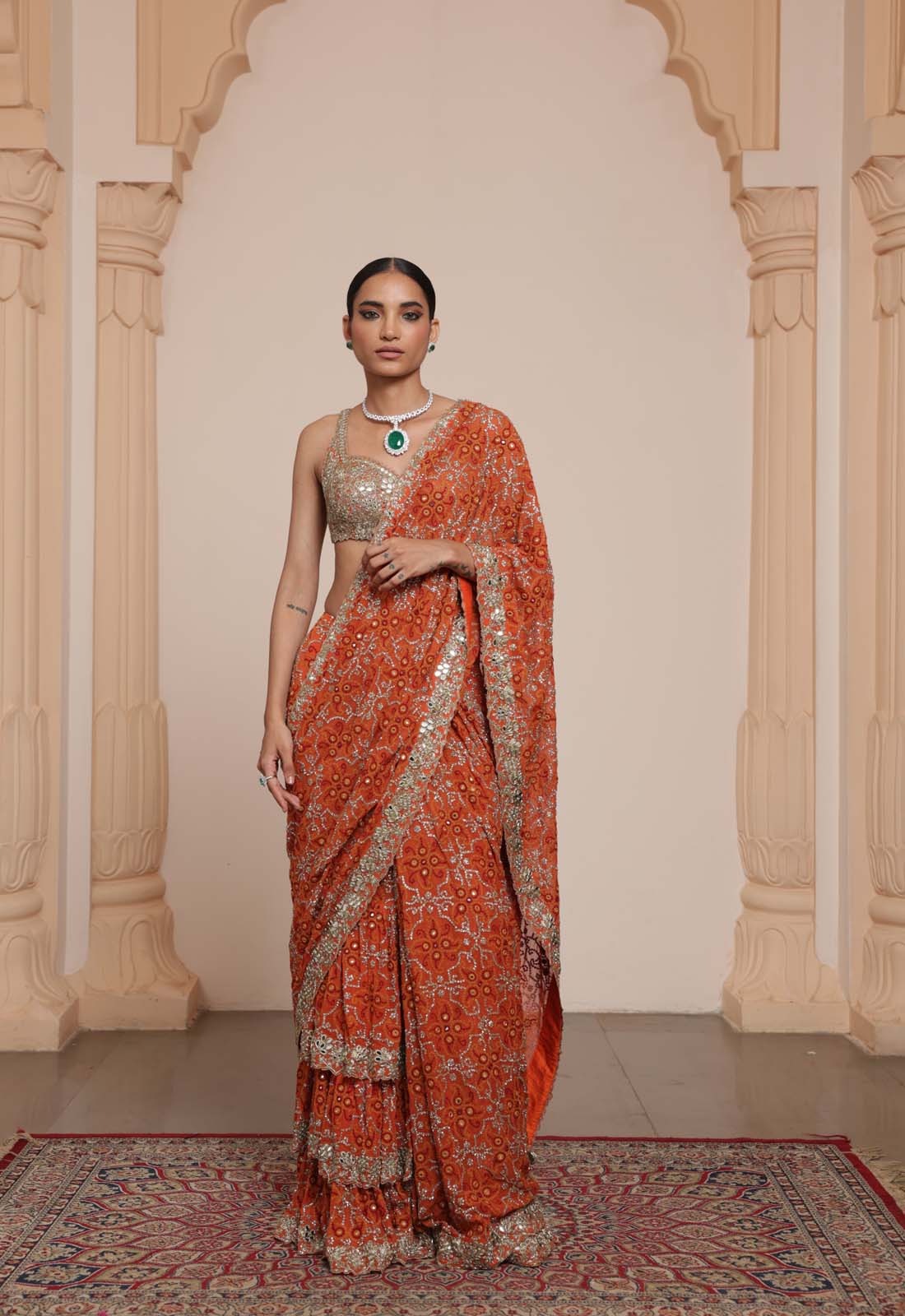 The top of the sari is crafted with a premium base fabric in warm orange and beige gold tones. Hand-embroidered motifs with multithread detailing, reflective mirrors, and delicate cutdana work bring a sophisticated texture and festive shimmer to the outfit. The design balances traditional bandhani artistry with contemporary elegance.