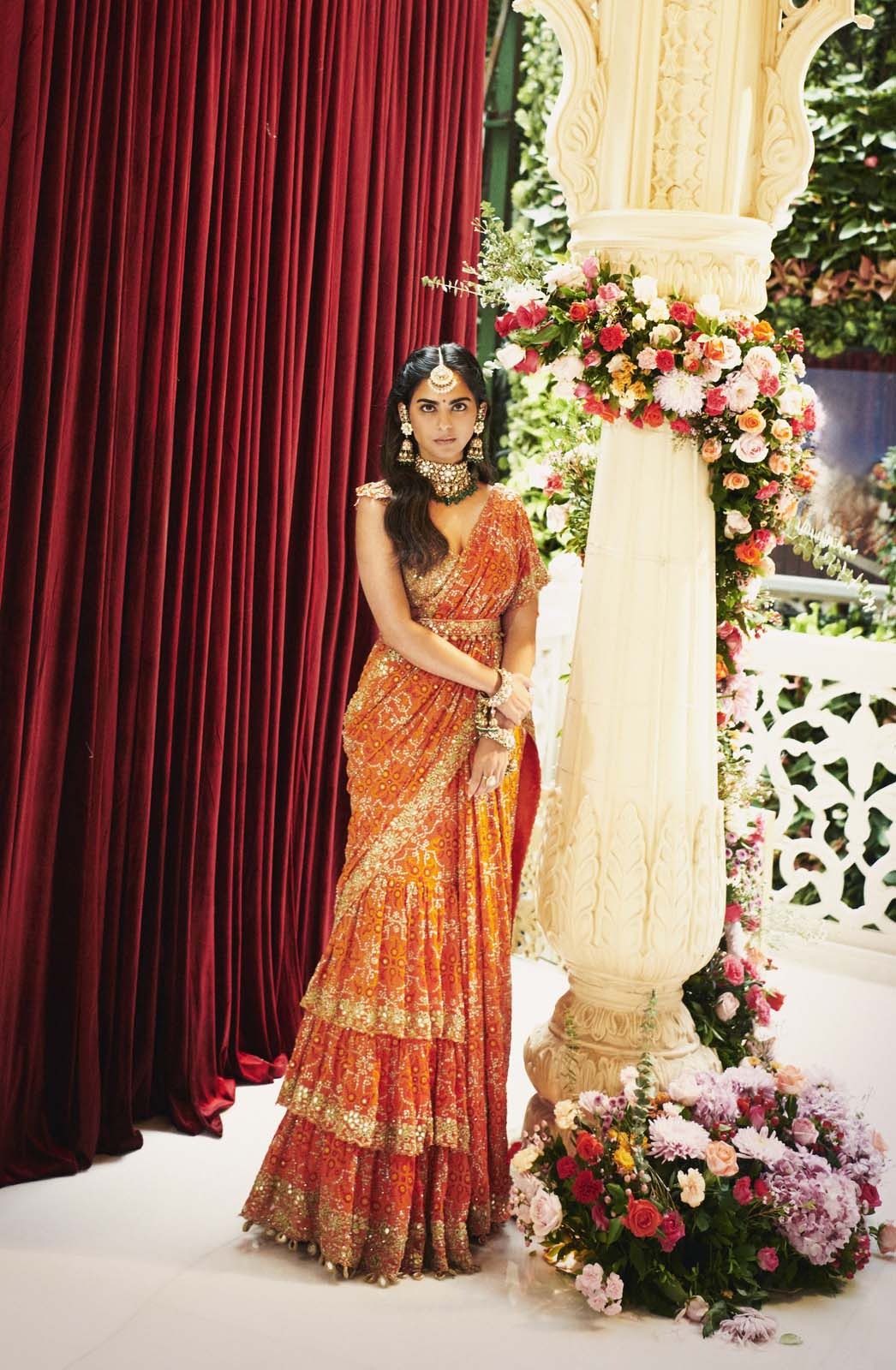 The sari’s tiered drape is designed to flow elegantly, offering a graceful silhouette while highlighting the detailed embroidery. The layers add volume and movement, enhancing the overall ensemble’s charm.