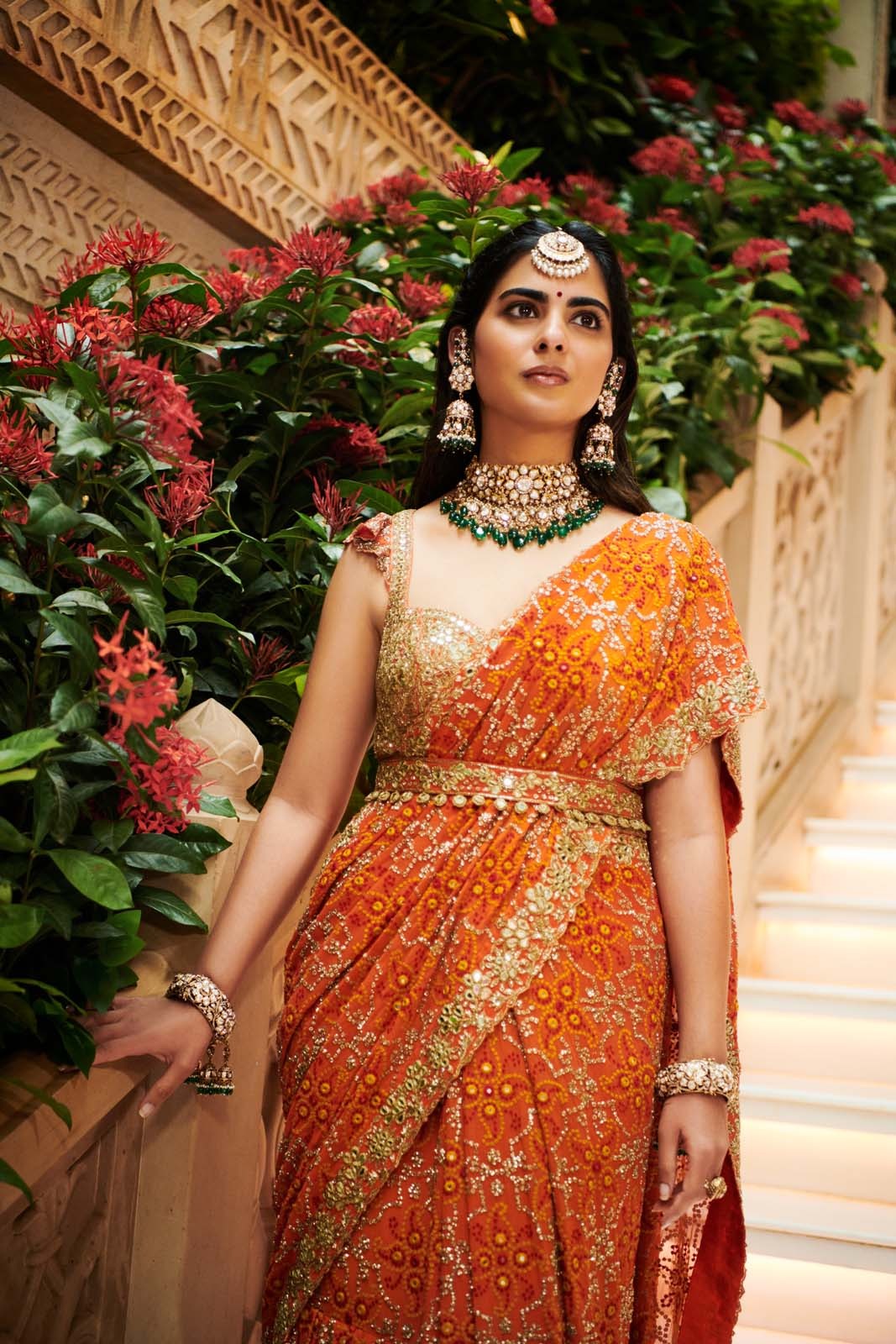 A vibrant orange bandhani sari set featuring hand-embroidered threadwork, mirrors, and cutdana, paired with a delicately embroidered belt for a complete festive and wedding-ready look.